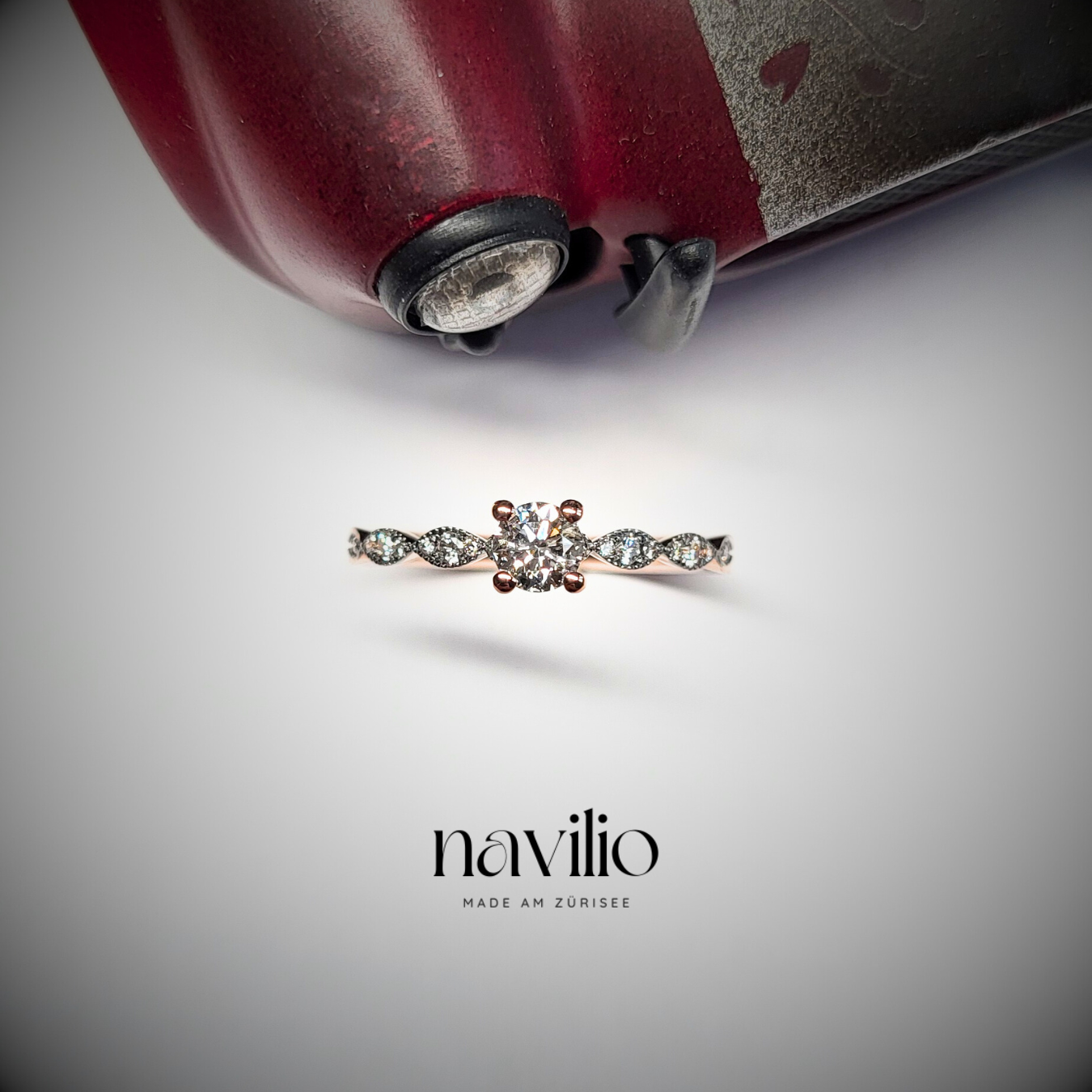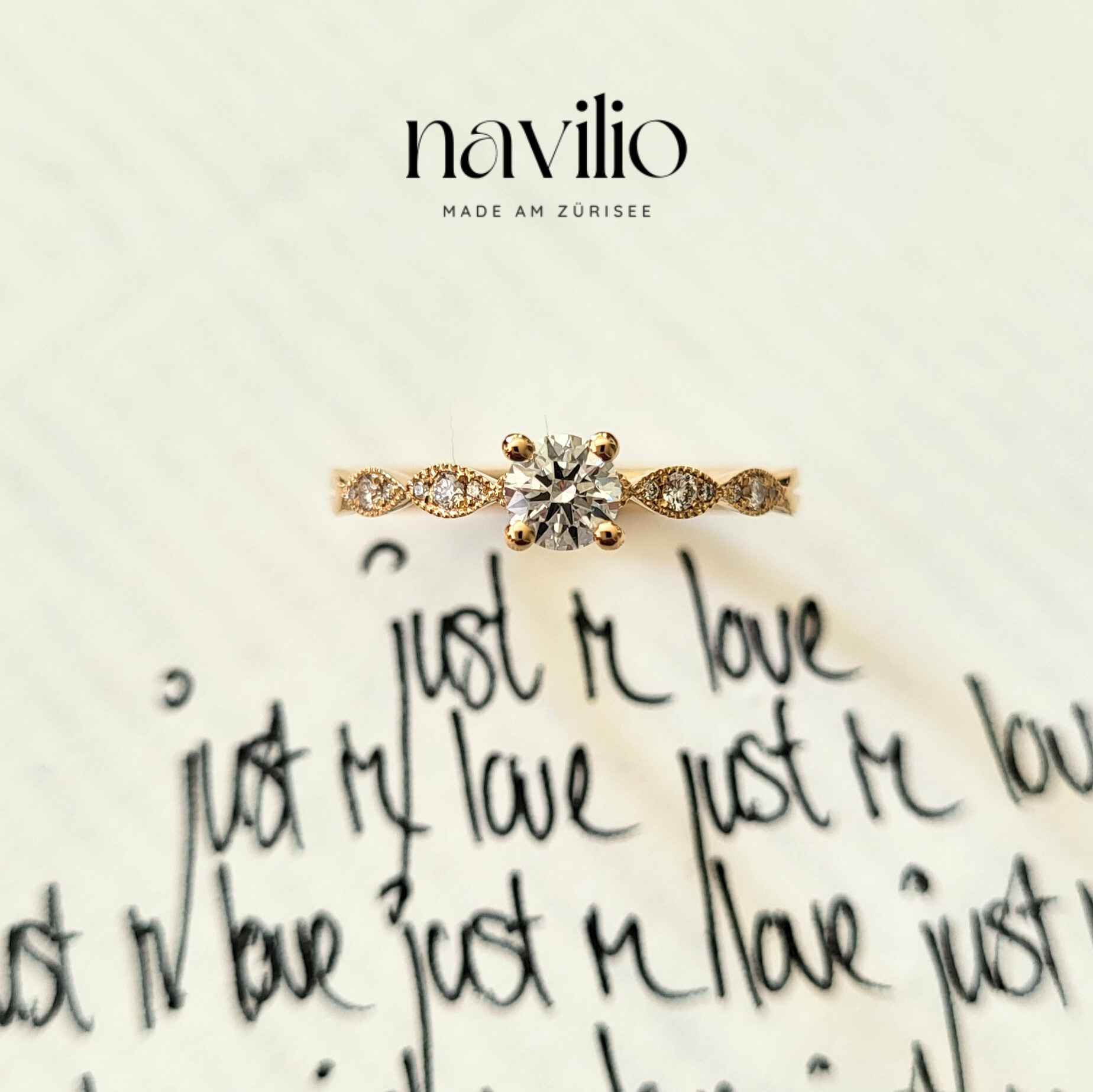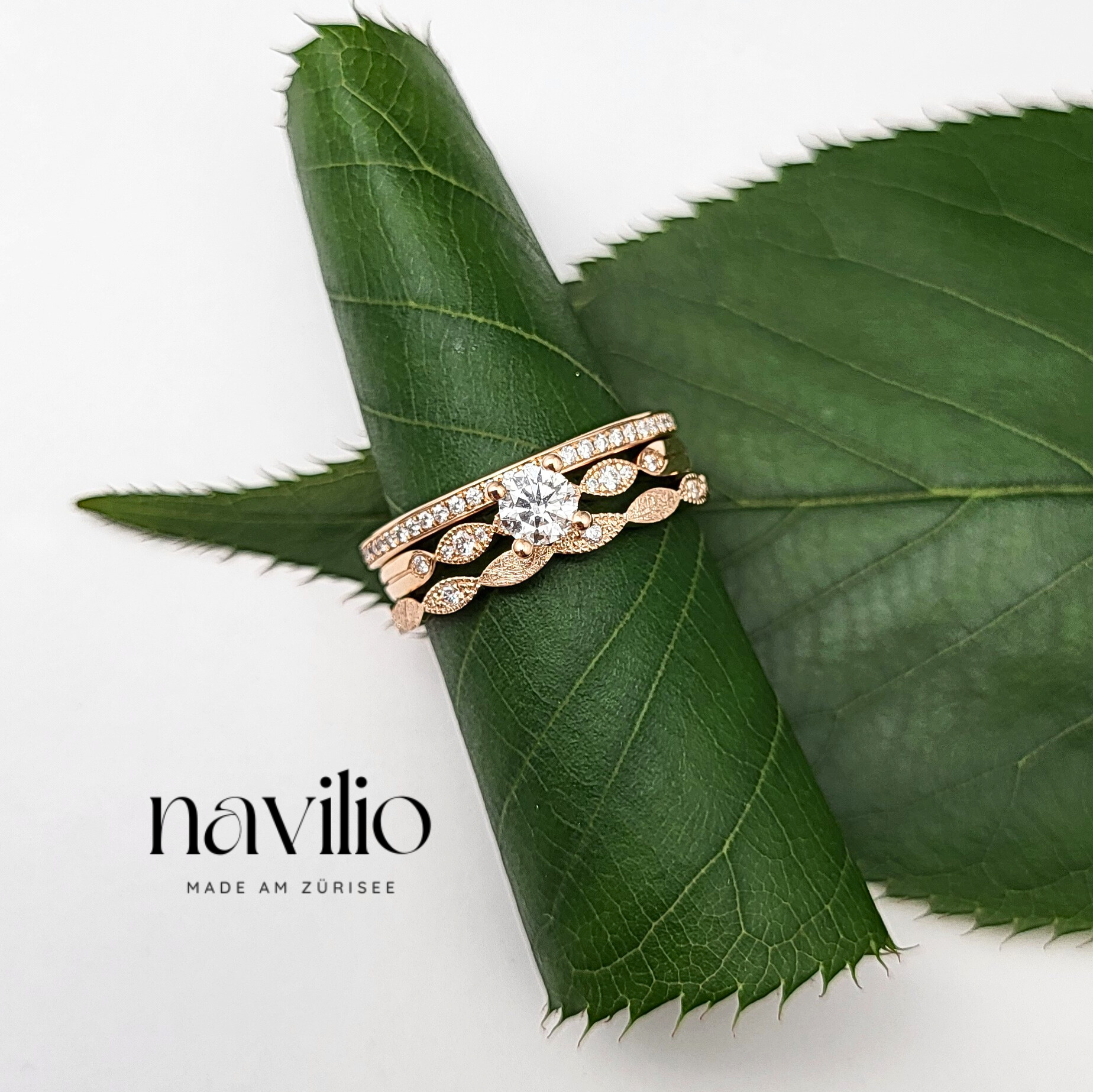 Die Navetten von der Natur, das Funkeln der Labordiamanten und das Öko-Gold kombiniert in einem Ring. Ein perfekter Solitaire für alle naturverbundene Menschen und für alle Frauen, die ihrem Stil