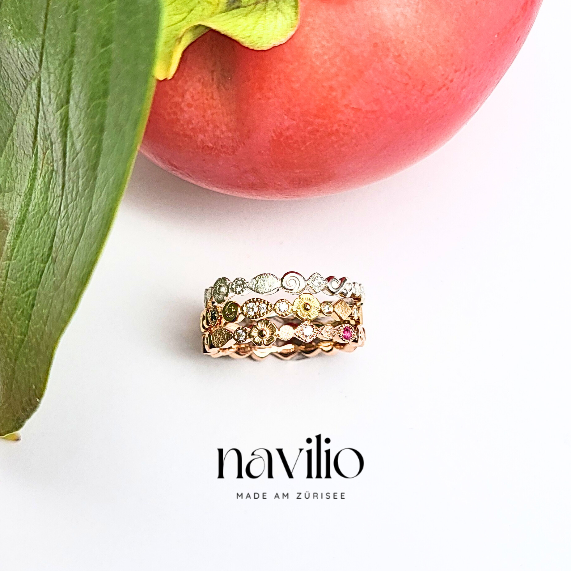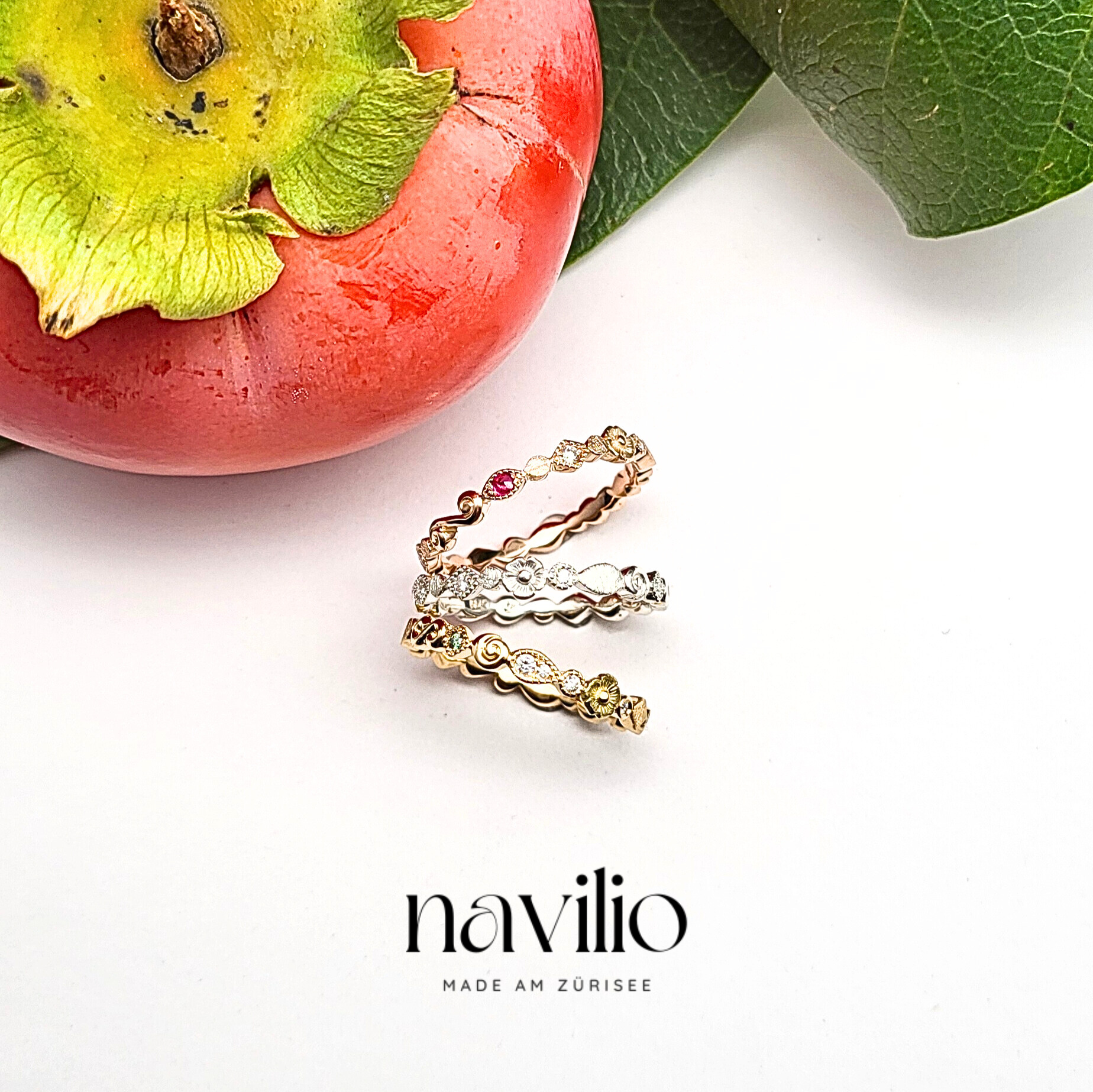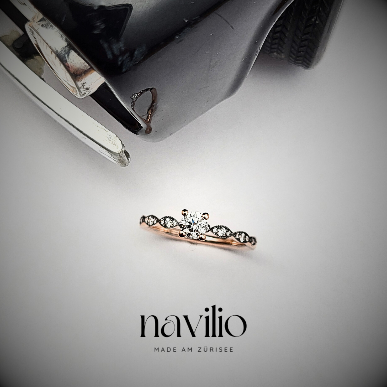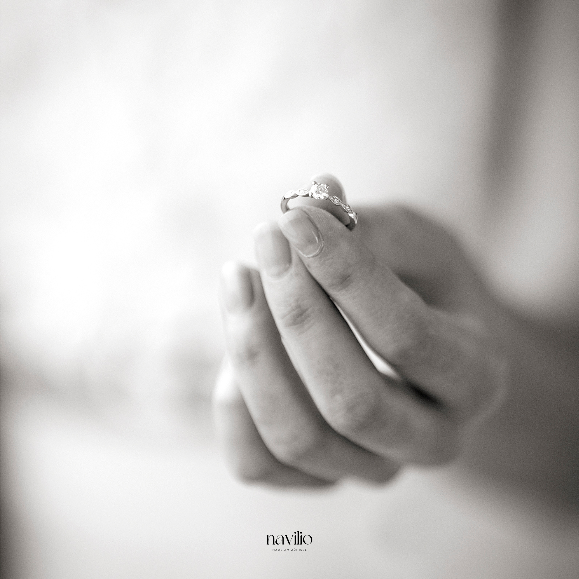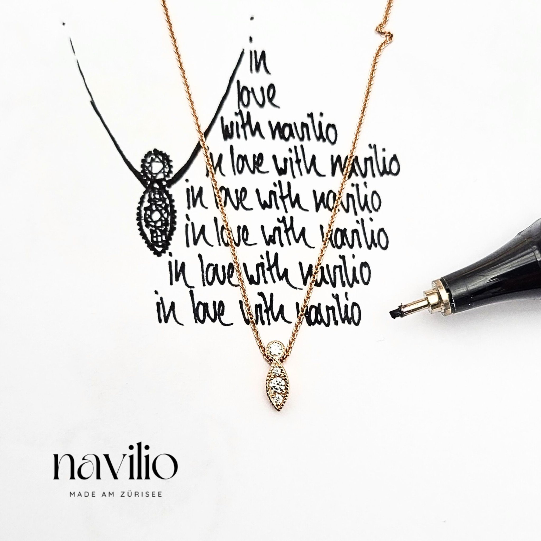 Navilio steht für Eleganz, Leichtigkeit, und Raffinesse. Die funkelnden, brillantbesetzten Navetten sind von zarten Millgriff umrundet.